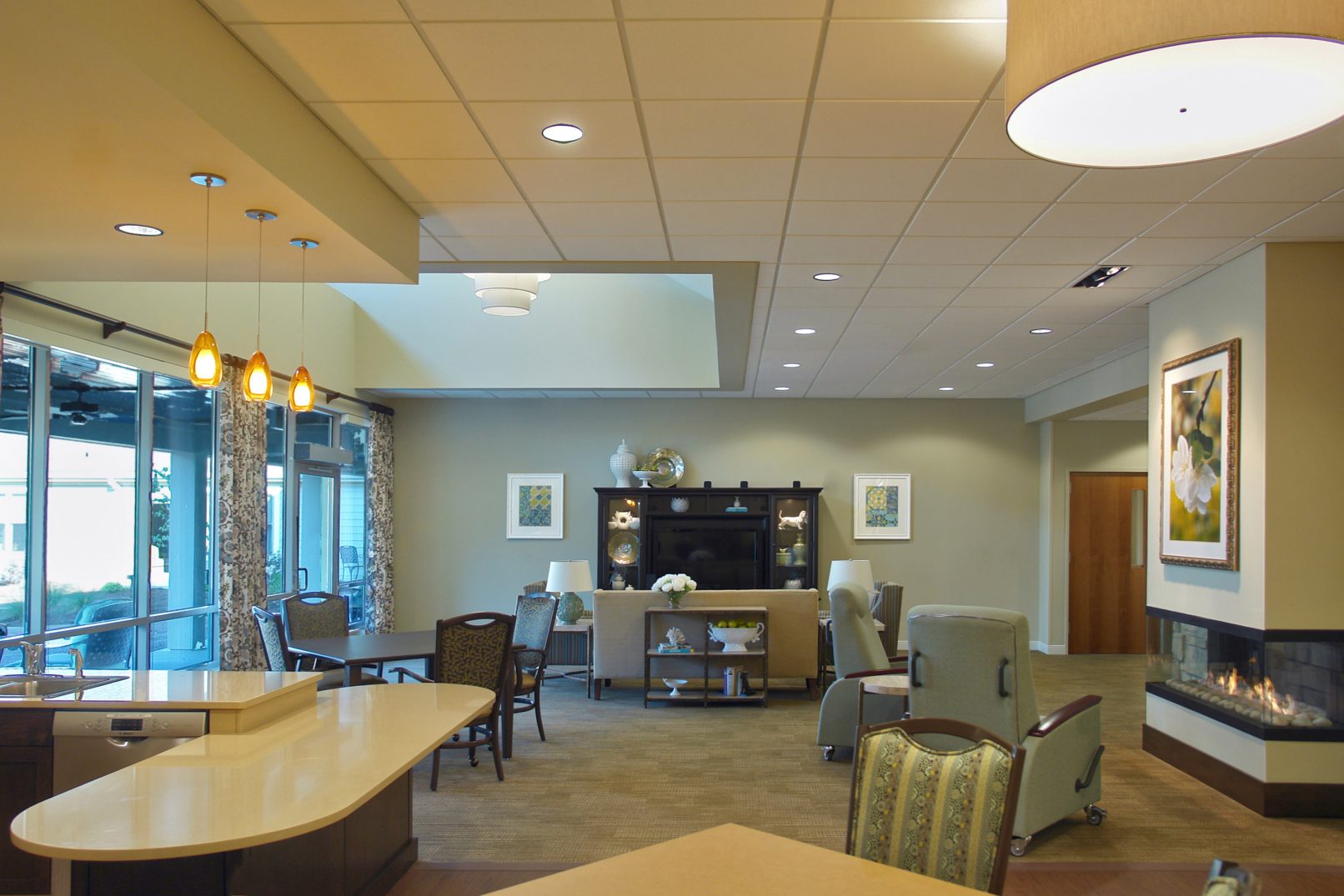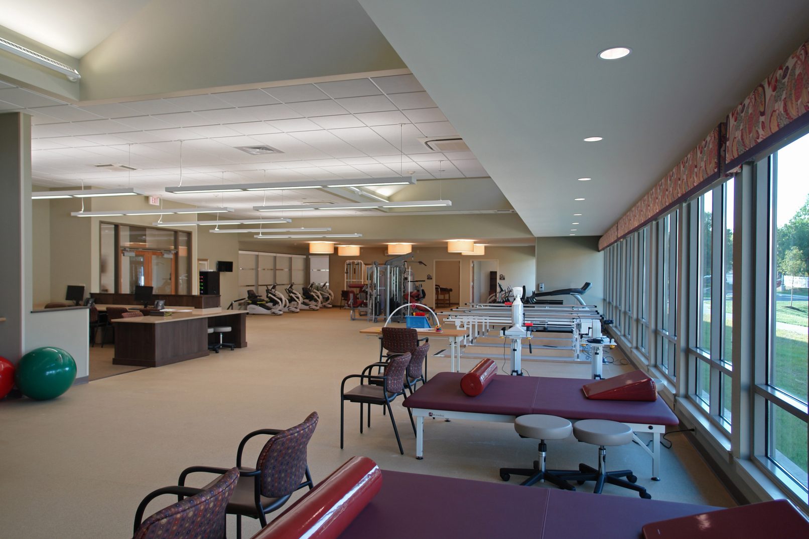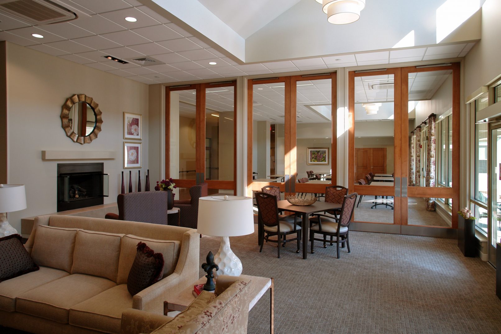This 60,000SF facility accommodates 62 beds within four neighborhood communities. Each neighborhood is self-sufficient with living, dining, and nursing functions. The neighborhoods are arranged around courtyards in order to shorten corridor lengths and maximize the amount of daylight illuminating the interior. The Rehabilitation Center will be used by residents and outpatients. The facility is conceived to serve patients for shorter terms. It targets people of all ages who have physical rehabilitation needs that can’t easily be met at home, such as persons who are recovering from surgery.
